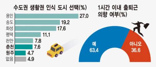 서울, 경기, 인천 주민들이 춘천과 원주보다 오히려 거리가 먼 충남 천안을 수도권으로 인식하는 비중이 높은 것을 조사됐다.