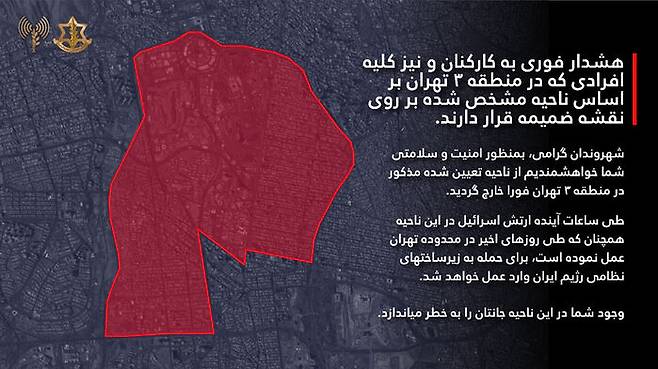 이스라엘군은 이날 오후 엑스(X)에 페르시아어로 "이스라엘군은 최근 테헤란 전역에 걸쳐 그랬듯 앞으로 몇시간 내로 테헤란 3구 지역에서 이란의 군사시설을 공격하는 작전을 펼 것"이라고 밝혔습니다.