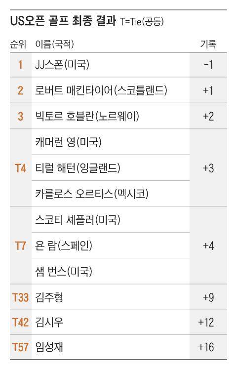 스폰은 12번 홀(파5) 버디를 시작으로 7개 홀에서 버디 4개와 보기 1개로 3타를 줄였다. 짧은 파4홀인 17번 홀(312야드)에서 원 온에 성공해 투 퍼트로 버디를 잡아 단독 선두에 나섰다. 그리고 18번 홀(파4)에서는 20m 거리 버디 퍼트에 성공했다. US오픈 역사에 남을 장면이었다. 스폰은 “플레이어스 챔피언십 때도 악천후로 경기가 중단된 적이 있었다. 그때 경험을 살려 더 좋은 경기를 할 수 있었다”고 했다. 스폰은 지난 3월 플레이어스 챔피언십에서 악천후로 하루 순연된 연장전에서 17번 홀(파3) 티샷을 물에 빠트리는 등 실수를 연발하며 매킬로이에게 패배했던 아쉬움을 털어냈다.