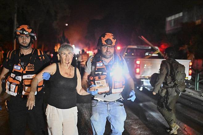 | 공포 휩싸인 시민들 15일(현지 시간) 이란 수도 테헤란에서 이스라엘의 공습으로 부상당한 시민이 붕대를 감은 채 부축을 받고 있다(위쪽 사진). 13일 이스라엘의 이란 기습 공격 이후 양국은 서로 대규모 공격을 주고받고 있다. 이날 이란의 공습을 받은 이스라엘 북부 도시 하이파에서 구조대가 부상당한 여성을 대피시키고 있다. 이스라엘에서는 16일 오전까지 최소 24명이 숨지고 592명이 다친 것으로 알려졌다. 이란에서는 최소 224명이 사망하고 1400여 명이 다쳤다. 테헤란·하이파=AP 뉴시스 |