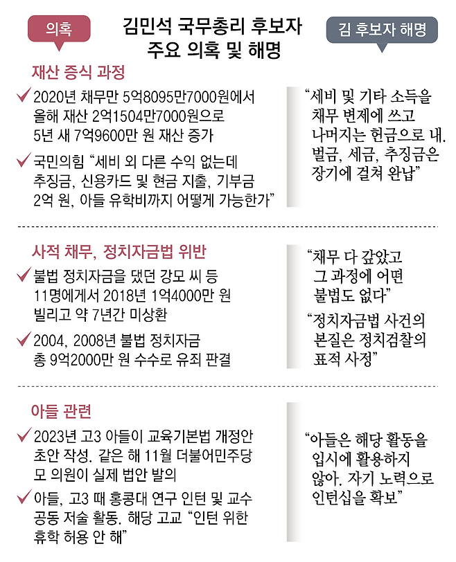 김 후보자는 2007∼2008년 강 씨로부터 불법 정치자금 2억5000여만 원을 받은 혐의 등으로 대법원에서 벌금 600만 원을 확정받았고, 2018년 강 씨에게 빌린 4000만 원은 최근 총리 지명 이후 갚은 것으로 전해졌다.