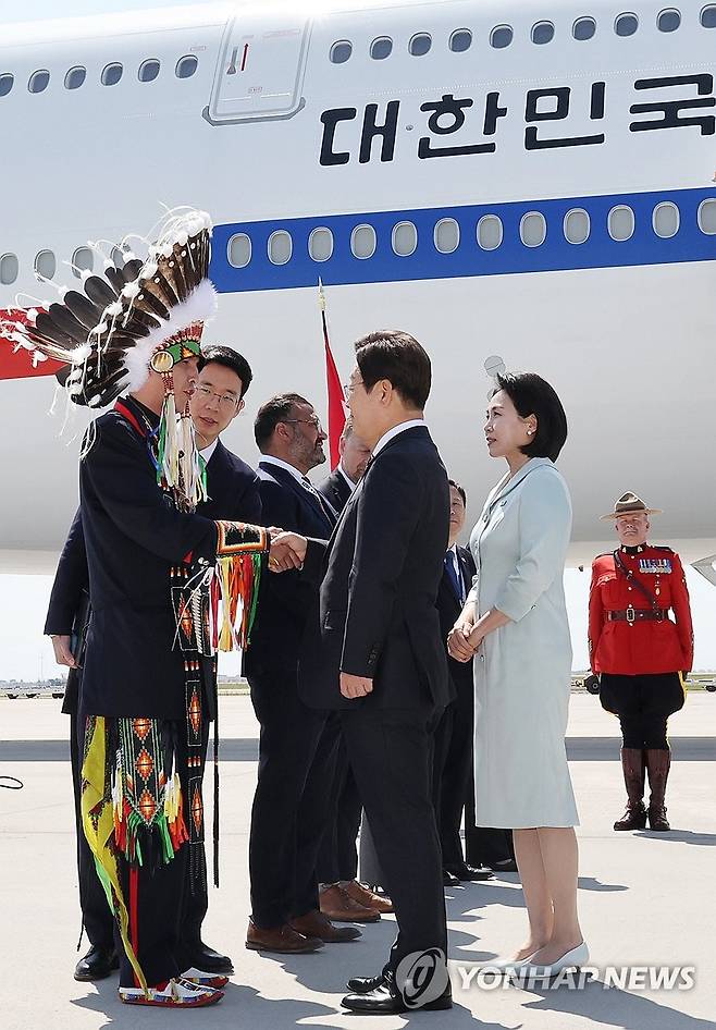(캘거리[캐나다]=연합뉴스) 한상균 기자 = 51차 주요 7개국(G7) 정상회의 참석하는 이재명 대통령이 16일(현지시간) 캐나다 앨버타주 캘거리국제공항에 도착해 캘거리 인근 캐나다 원주민 공동체 대표자와 인사하고 있다. 2025.6.17