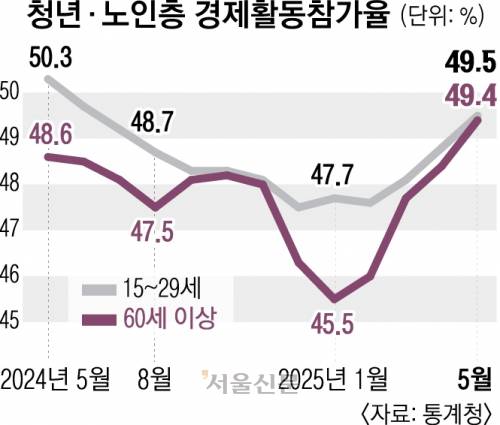60세 이상의 경제활동참가율(전체 인구 대비 경제활동인구 비율·경활률)이 청년층(15~29세)의 경활률을 역전하는 '실버크로스'가 초읽기에 들어갔다.