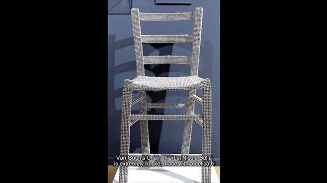 커플이 부순 의자는 이탈리아 출신 화가이자 조각가인 니콜라 볼라의 작품으로, 기계로 자른 반짝거리는 크리스털 수백 개로 덮여있습니다.