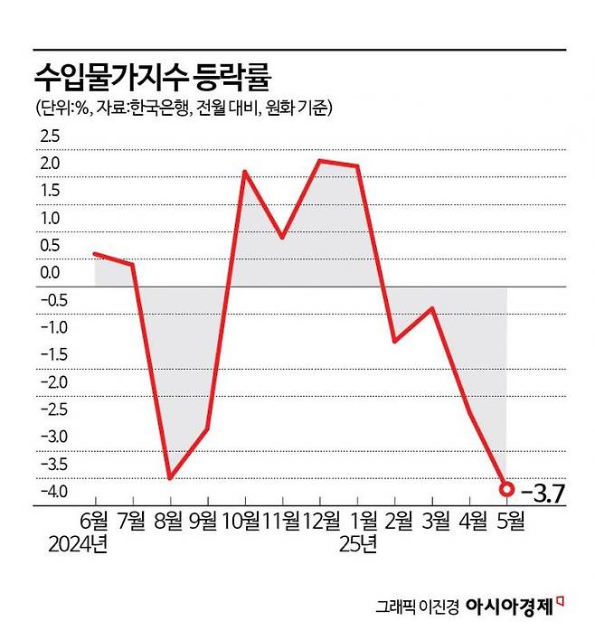 17일 한국은행이 발표한 '2025년 5월 수출입물가지수 및 무역지수(잠정)'에 따르면 지난달 수입 물가(원화 기준)는 전월 대비 3.7% 하락했다. 2023년 11월(-4.3%) 이후 1년6개월 만에 최대 하락률이다. 전년 동월 대비로도 5.0% 내렸다. 국제유가와 원·달러 환율이 모두 내리면서 원유 등 광산품을 중심으로 하락세를 나타냈다.