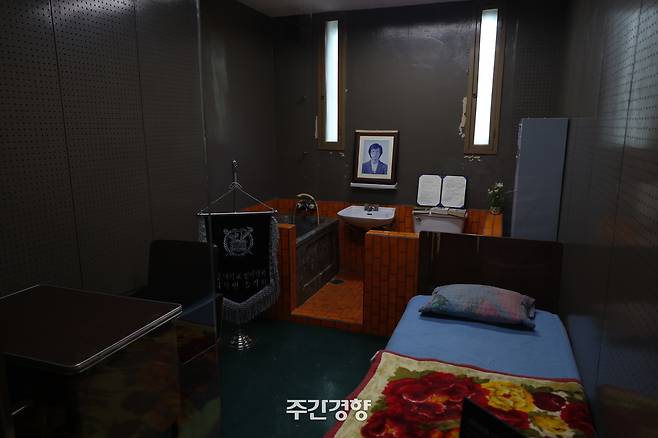 탱크가 밀려오는 듯한 육중한 철문 소리, 좁고 가파른 나선형 철계단을 내디딜 때마다 울리는 쿵쿵 소리, 눈을 가린 채 도착한 고문 피해자들에게 이곳은 소리부터 공포였을 것이다. 빛이 들지 않는 지하실인 줄로만 알았던 조사실은 5층에 있었고, 취조와 고문을 위해 세심하게 설계됐다. 물고문을 당했을 욕조는 공포스러웠다. 16개의 조사실은 양옆으로 엇갈려 배치돼 조사실 문을 열어도 마주하는 건 벽뿐이었다. 자해를 막기 위해 책상과 의자는 바닥에 고정돼 있고, 창문은 빛 한 줌 들어올 크기밖에 되지 않았다.