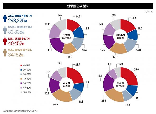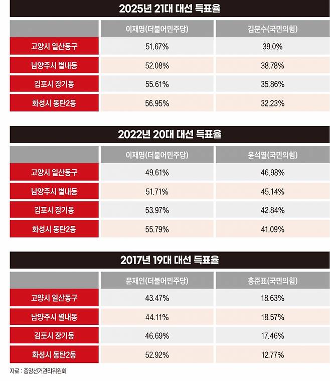 일산 등 1기신도시와 동탄, 김포 같은 2기신도시가 각각 1990년대 초, 2000년대 후반부터 형성됐다는 점에서 인구구조는 40~60대 중심으로 굳어지는 추세다. 19대 대선 시기만 해도 30대 비율은 높았다. 이들이 20대, 21대 대선을 거치며 40대로 진입하면서 지역 내 민주당 득표율을 끌어올리는 역할을 하고 있다.