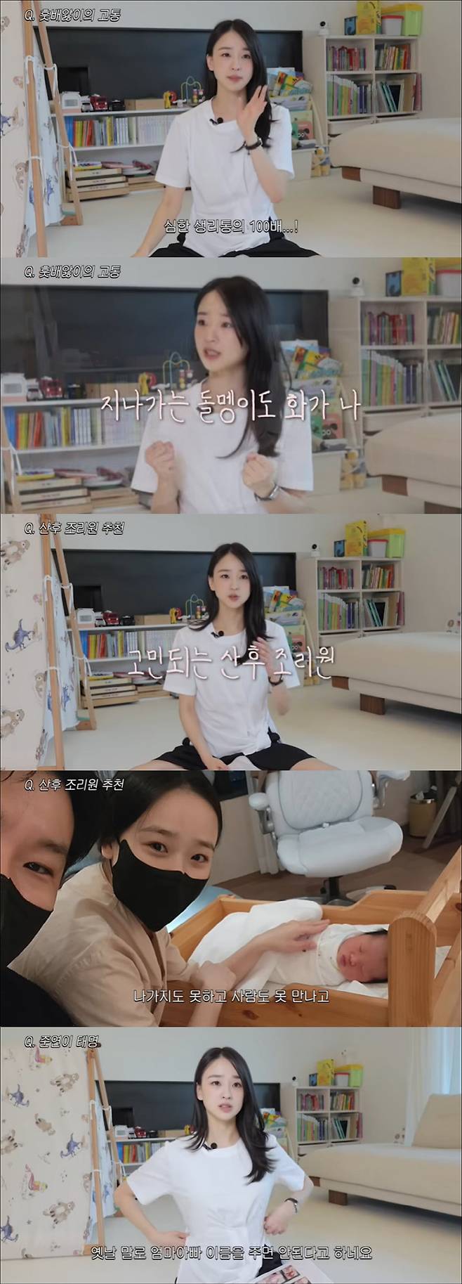 출산 후 훗배앓이가 심했다는 손연재는 "생리통 제일 심할 때의 100배다. 그걸 계속 하니까 지나가는 돌멩이도 화가 난다. 돌멩이가 지나가진 않지만 그만큼 말도 안 되게 화가 났다. (출산이) 진짜 힘들구나라는 걸 느꼈다. 아기 낳고도 출산의 한 부분이구나 싶었다"며 "'조리원 천국이다', '조리원에서 푹 쉬었다' 하는데 저는 정말 개인적인 의견인데 아기를 다시 낳으면 조리원에 대해서는 고민이 된다"고 밝혔다.