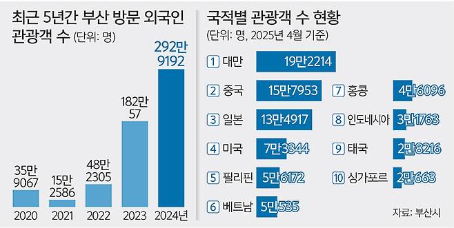 올 4월까지 부산을 찾은 외국인 관광객 수가 100만명을 넘어섰다. 2014년 외국인 관광객 수 발표 이래 가장 빠르고, 외국인 관광객 수가 가장 많았던 2016년과 비교해도 한 달이나 앞선 시점이다.