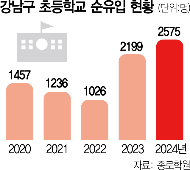 지난해 서울 강남구 순유입 초등학생 수가 2600명에 육박해 최근 10년 새 최고치를 기록한 것으로 조사됐다.