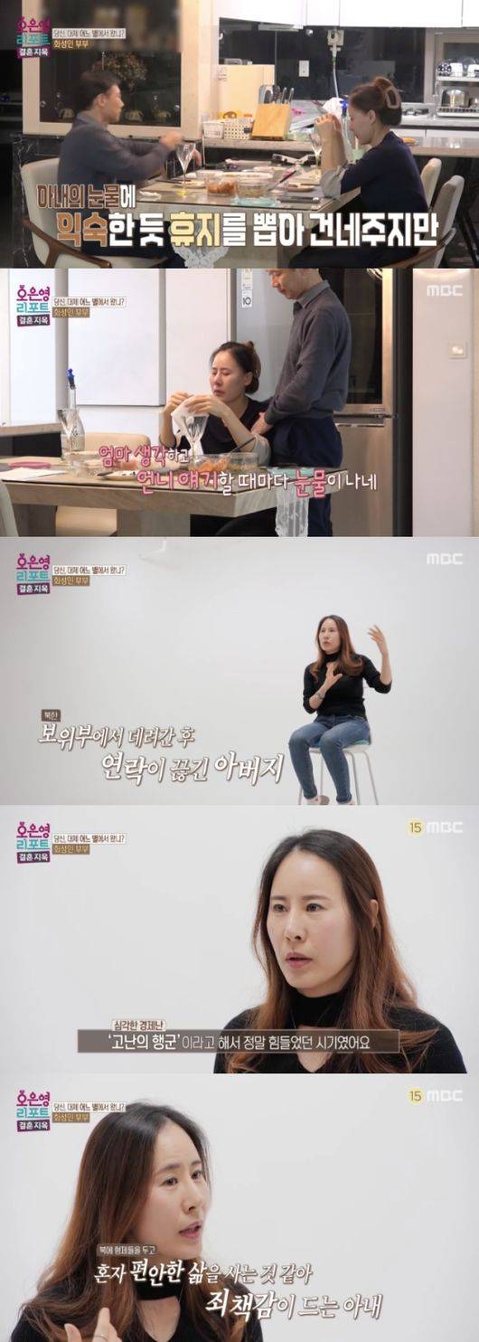 아내는 “아버지, 첫째, 둘째 언니랑 같은 회사에 다녔다. 퇴근 시간이 지나도 아버지가 집에 들어오지 않았다. 다음 날 출근해 물어보니 ‘검은 차가 와서 너희 아버지를 모시고 가더라’ 하더라. 보위부에서 데려간 후 연락이 끊긴 것이다. 그러고 나서 엄마가 일주일 뒤에 돌아가셨다. 스트레스로 뇌출혈이 와서 돌아가신 것이다”라고 북한에 있던 당시를 회상했다.