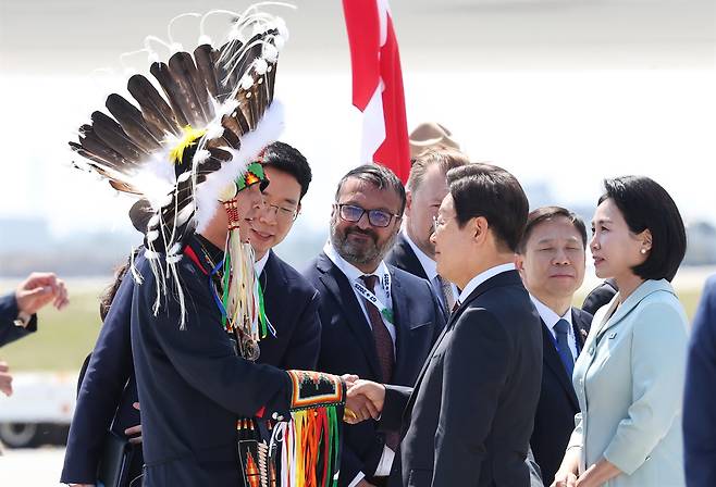 | ▲ 51차 주요 7개국(G7) 정상회의 참석하는 이재명 대통령이 16일(현지시간) 캐나다 앨버타주 캘거리국제공항에 도착해 캘거리 인근 캐나다 원주민 공동체 대표자와 인사하고 있다. |