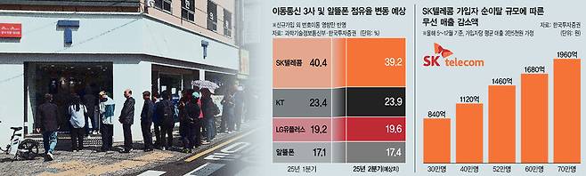 상황이 달라진 건 에스케이텔레콤 유심 정보 유출 사고가 불거진 뒤다. 정보 유출이 공개된 4월22일부터 이달 8일까지 에스케이텔레콤에서 케이티와 엘지유플러스 등 다른 통신사로 이탈한 가입자 수는 52만1741명이다. 에스케이텔레콤의 사고 대응에 실망한 가입자들이 번호이동 때 내야 하는 위약금을 회사가 면제해주지 않았음에도 불구하고 이미 50만명이 넘게 빠져나간 셈이다. 업계에선 에스케이텔레콤이 지난 10년간 지켜온 휴대전화 회선 점유율이 올 2분기 40% 아래로 떨어졌을 것으로 보고 있다. 지난달 5일부터 한 달 넘게 신규 영업이 중단된 게 결정적 영향을 끼쳤다. ‘업계 1위’를 사수하려는 에스케이텔레콤은 경쟁사에 빼앗긴 가입자를 올 하반기 동안 되찾아와야 하는 상황이 됐다.