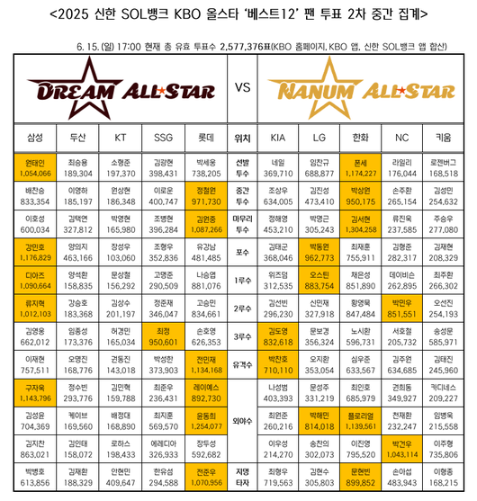 KBO(한국야구위원회)가 지난 16일 발표한 2025 신한 SOL뱅크 KBO 올스타전 베스트12 팬 투표 2차 중간 집계 결과에 따르면 두산은 1차에 이어 2차에서도 포지션별 1위 선수가 탄생하지 않았다.