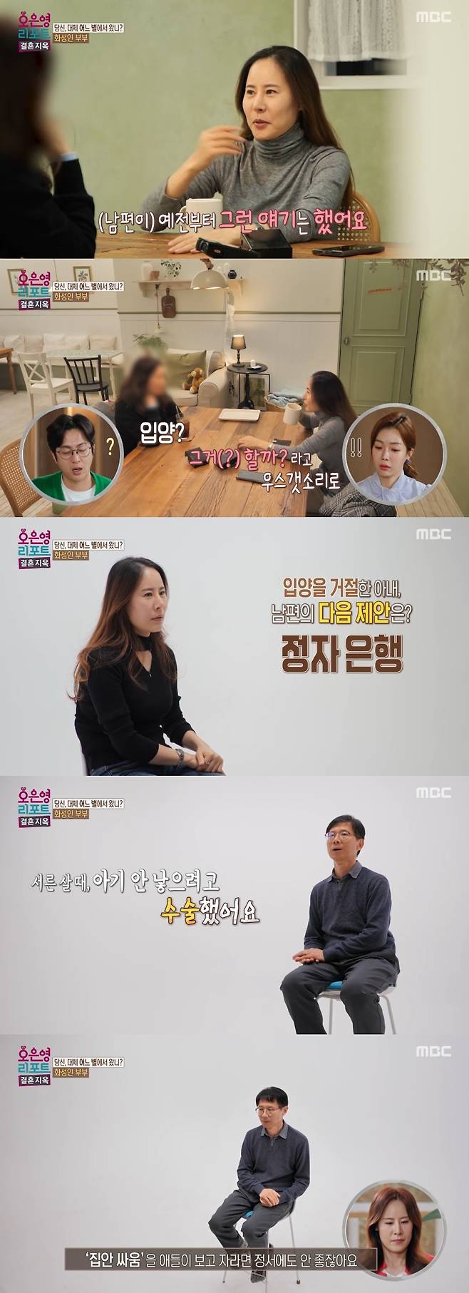 또한 두 사람은 2세 계획에서도 마찰이 있었다. 아내는 "예전부터 그런 얘기를 했다. '입양할까?'라고 우스갯소리로"라며 "남편은 제가 자꾸 아이 갖고 싶다고 하니까 '입양하자' 처음에는 입양하자는 얘기를 했다"라고 말했다.