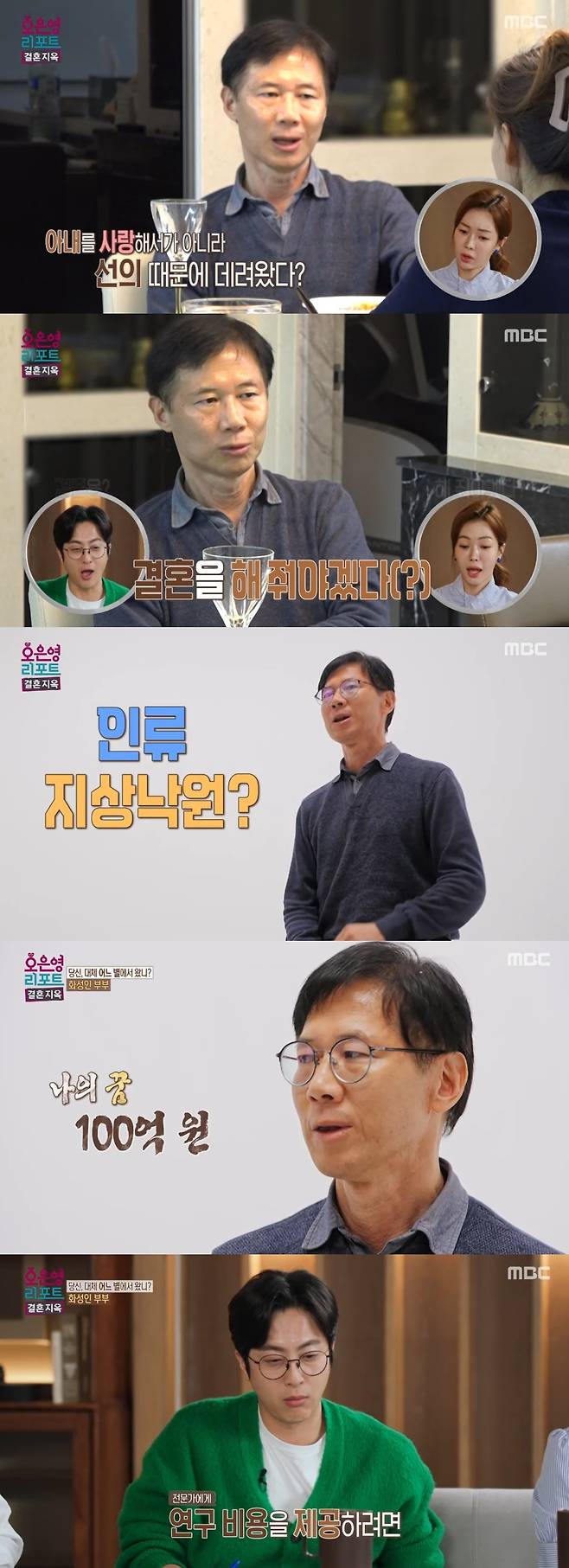16일 방송된 MBC '오은영 리포트-결혼지옥'(이하 '결혼지옥')에서는 대화할수록 안드로메다(?)로 향하는 아내와 자신의 세계관을 이해해 주지 않는 아내가 답답한 남편, '화성인 부부'가 등장했다.