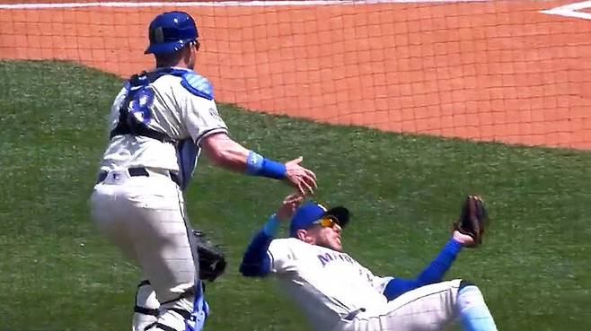 포수가 뜬 공을 실수로 놓칠 뻔했는데, 3루수가 번개같이 나타나 잡아냈습니다.