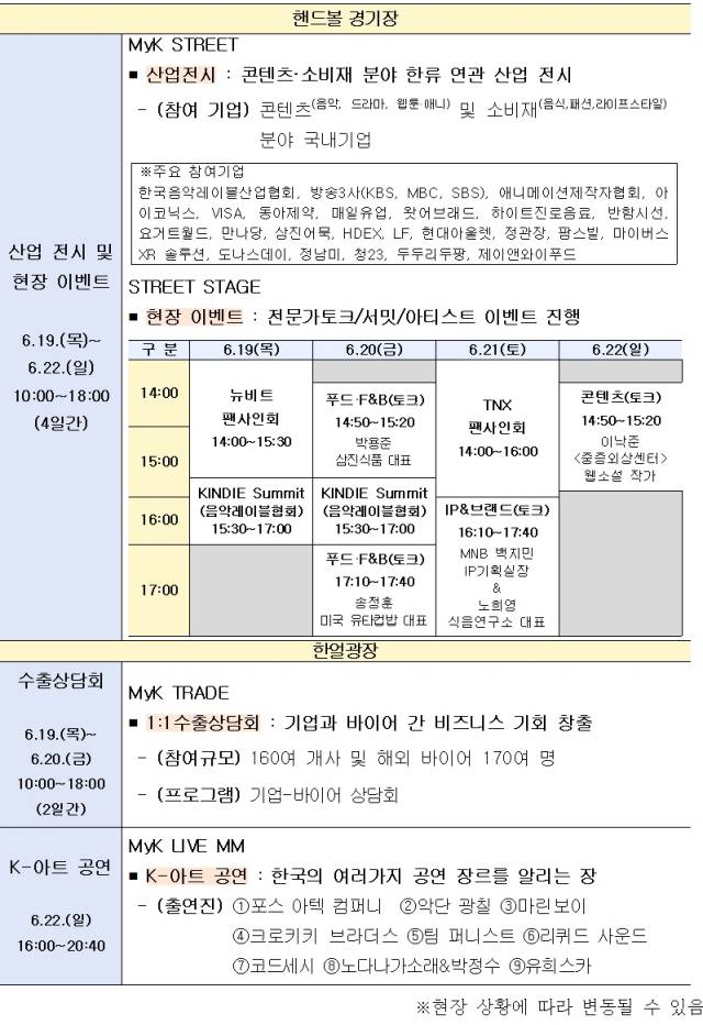 이와 함께 핸드볼경기장 이벤트 무대에서는 콘텐츠 산업 관계자와 한류 팬을 아우르는 회담과 강연, K팝 가수와의 만남 등을 진행한다. 한국음악레이블산업협회는 음악 전문가 중심으로 ‘킨디서밋(KINDIE Summit)’을 열어 음악 산업의 흐름과 확장 방향을 다각도로 조명한다. K푸드와 지식재산(IP), 콘텐츠 등 분야별 전문가들은 강연을 통해 관객과 소통한다. 삼진어묵 박용준 대표와 유타컵밥 송정훈 대표, 엠엔비 백지민 실장, 식음연구소 노희영 대표, ‘중증외상센터’ 이낙준 작가 등이 강연자로 나선다. 신인 K팝 가수 뉴비트와 티엔엑스(TNX)는 팬 사인회를 열어 국내외 한류 팬들과 직접 교류한다.
