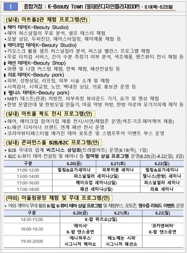 올해는 ‘K뷰티’의 5대 분야인 헤어, 메이크업, 패션, 의료, 웰니스 관광콘텐츠를 종합적으로 체험할 수 있는 종합거점 ‘K뷰티 타운’을 6월 19~22일 서울 동대문디자인플라자(DDP) 실내외 아트홀과 어울림광장 일대에서 운영한다. 개막식은 19일 오후 7시 DDP 어울림광장에서 개최하며, 개막식에서는 ‘K뷰티’를 주제로 한 뮤지컬 공연과 개막 축하 행사 등 다양한 볼거리를 선사한다.
