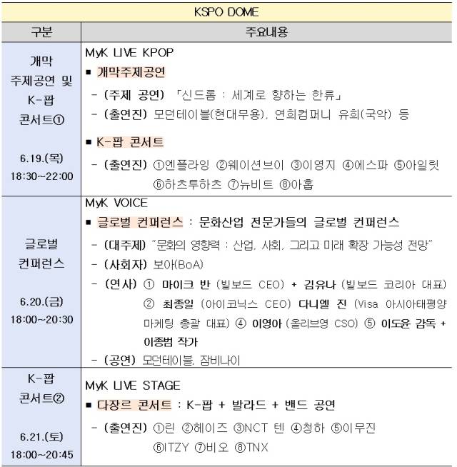 개막일인 6월 19일과 21일 케이스포돔(옛 올림픽체조경기장)에서는 인기 K팝 가수부터 미래 K팝을 이끌 신인 가수까지 다양한 무대를 만나볼 수 있는 K팝 콘서트가 열린다. 19일에는 엔플라잉과 웨이션브이, 이영지, 에스파, 아일릿, 하츠투하츠, 뉴비트, 아홉이, 21에는 린, 헤이즈, 엔시티 텐(NCT TEN), 청하, 이무진, 있지(ITZY), 비오, 티엔엑스(TNX)가 무대에 오른다. 특히 K팝 콘서트는 해외 한류팬 2만여 명을 포함 3만여 명이 관람할 것으로 예상된다.