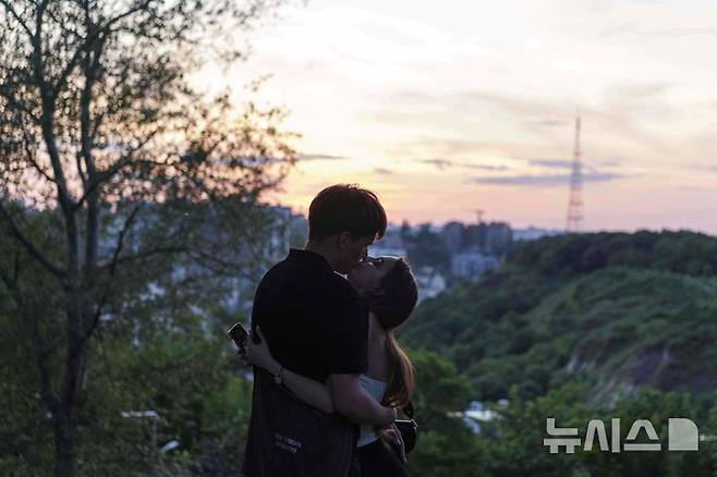 [키이우=AP/뉴시스] 16일(현지 시간) 우크라이나 키이우에서 공습경보가 울리는 가운데 젊은 남녀가 입맞춤하고 있다. 2025.06.17.