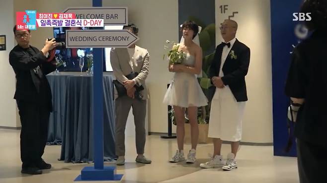 이날의 주인공인 최여진과 김재욱 역시 미니 드레스와 반바지 턱시도에 스니커즈를 신고 하객을 맞았다.