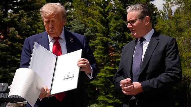 도널드 트럼프 미국 대통령은 16일(현지시간) 캐나다 앨버타주의 휴양도시 캐내내스키스에서 열린 주요 7개국(G7) 정상회의 참석 계기에 키어 스타머 영국 총리와 양자회담을 하고 양국 간 무역협정을 체결했습니다.