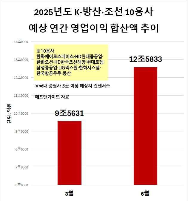 금융정보업체 에프앤가이드에 따르면 전날 기준으로 방산·조선주 10개사의 올해 연간 영업이익 예상 합산액은 12조5833억원에 이를 것으로 보인다. 3개월 전 예상치인 9조5631억원 대비 31.58%나 증가한 것이다.