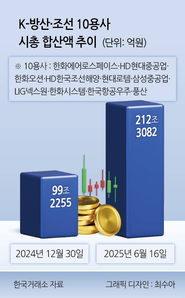 17일 한국거래소에 따르면 국내 주요 방산 섹터 6개 종목(한화에어로스페이스·현대로템·LIG넥스원·한화시스템·한국항공우주·풍산)과 조선 섹터 4개 종목(HD현대중공업·한화오션·HD한국조선해양·삼성중공업)의 전날 종가 기준 시총 합산액은 212조3082억원으로 작년 말(2024년 12월 30일) 종가 기준 99조2255억원 대비 113조827억원 증가한 것으로 나타났다.