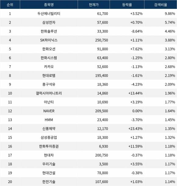 이어 삼성전자(005930)가 검색비율 2위를 기록하며 0.70%의 상승세를 보이고 있다. 검색비율 3위의 한화솔루션(009830)은 -8.64% 하락하며 출발했다. 검색비율 4위 SK하이닉스(000660)는 개장 초반 1.11% 상승 중이다. 검색비율 5위 한화오션(042660)은 7.62%의 상승세를 보이고 있다.