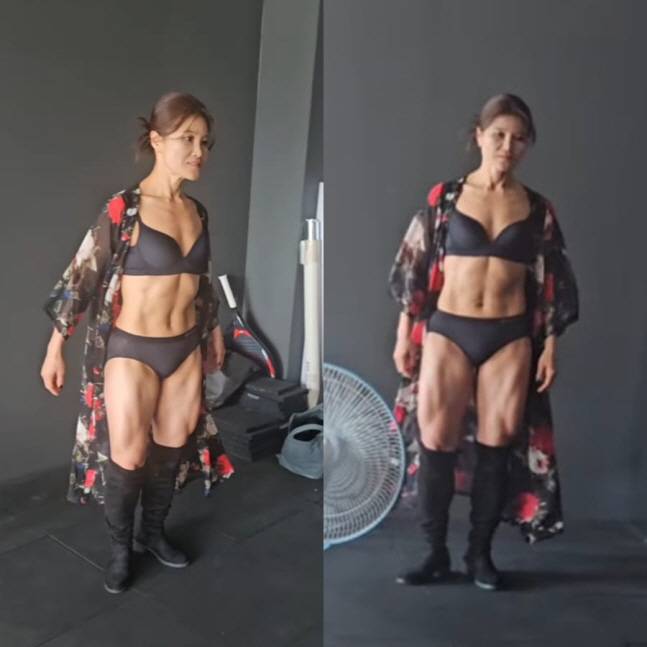 영상 속 김혜선은 블랙 스포츠 웨어에 로브를 걸친 채 바디프로필 촬영에 임하고 있었고, 무엇보다 눈길을 끈 건 김종국도 울고 갈 허벅지 근육과 선명한 식스팩이었다.