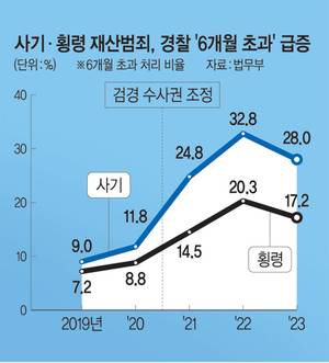 사기 범죄의 경우 경찰의 6개월 초과 처리 사건 비율은 2020년엔 11.8%에 불과했지만, 수사권 조정 후에는 24.8%(2021년)→32.8%(2022년)→28.0%(2023년)였다. 경찰에 대한 검찰의 수사지휘가 가능했을 때는 20% 안팎이던 경찰의 3개월 초과 처리 사건 비율은 2021년 이후 40∼60%대로 급증했다. 검찰이 처리한 피의자 수도 236만1611명(2019년)→150만2925명(2023년)으로 줄었으나 3개월 초과 처리비율은 같은 기간 6.8%에서 10.2%로 늘었다. 검찰청이 폐지되면 수사 장기화 문제는 더욱 심각해지고 그 결과 범죄피해자의 고통만 가중될 것이다.