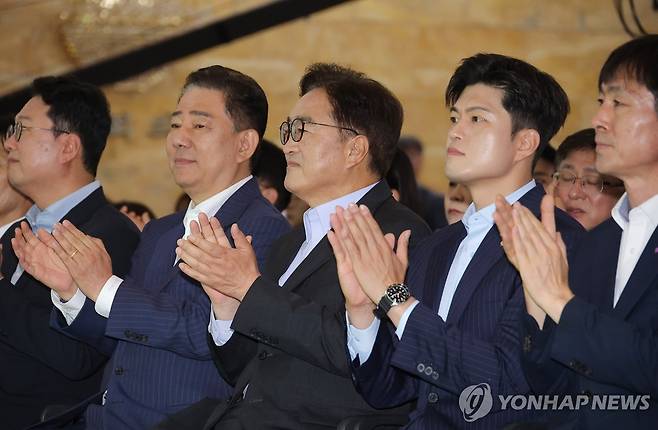 (서울=연합뉴스) 류영석 기자 = 우원식 국회의장, 더불어민주당 김병기 당대표 직무대행 겸 원내대표, 국민의힘 김용태 비상대책위원장 등이 17일 서울 여의도 국회 탄소 중립 선언식에서 박수치고 있다. 2025.6.17