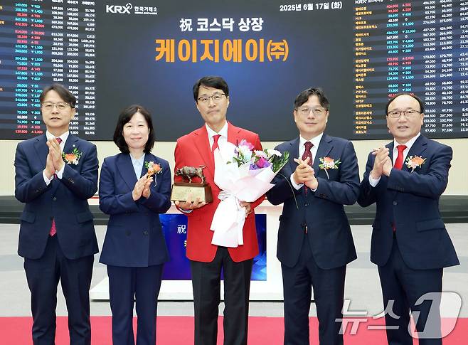 (서울=뉴스1) = 17일 서울 영등포구 한국거래소에서 열린 케이지에이 코스닥시장 상장기념식에서 김대영 한국IR협의회 부회장(왼쪽부터), 이미현 한국거래소 코스닥시장본부장보, 김옥태 케이지에이 대표이사, 이충훈 삼성증권 부사장, 강왕락 코스닥협회 부회장이 기념 촬영을 하고 있다. (한국거래소 제공. 재판매 및 DB 금지) 2025.6.17/뉴스1