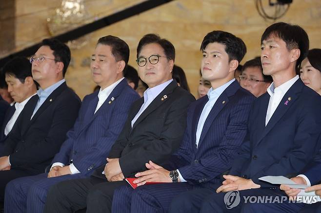 (서울=연합뉴스) 류영석 기자 = 더불어민주당 김병기 당대표 직무대행 겸 원내대표(왼쪽 두 번째부터), 우원식 국회의장, 국민의힘 김용태 비상대책위원장 등이 17일 서울 여의도 국회 탄소 중립 선언식에 참석해 있다. 2025.6.17