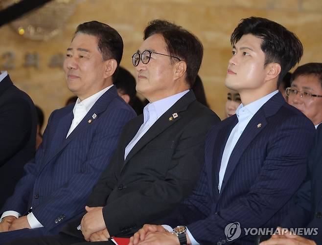 (서울=연합뉴스) 류영석 기자 = 우원식 국회의장(가운데), 더불어민주당 김병기 당대표 직무대행 겸 원내대표(왼쪽), 국민의힘 김용태 비상대책위원장이 17일 서울 여의도 국회 탄소 중립 선언식에 참석해 있다. 2025.6.17