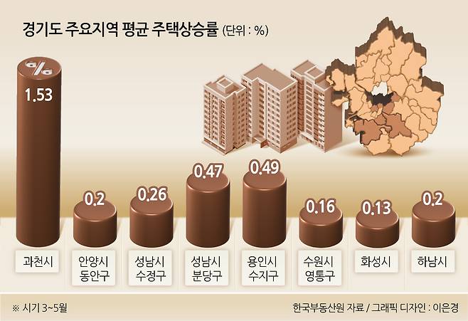 경기도의 집값 상승세는 지표로도 확인된다. 한국부동산원 월간 주택가격 동향을 살펴보면 경기도 상승장을 이끌던 과천, 성남시 분당구, 용인시 수지구 외에도 지난 3월~5월 안양시 동안구, 성남시 수정구, 하남시, 수원시 영통구, 화성시 등의 지수가 상승전환하거나 상승폭을 키웠다. 특히 경기도 내 41개 시·일반구 중 14개가 3~5월 경기도 평균 물가상승률(0.03%)을 높게 상회한 것으로 나타났다.