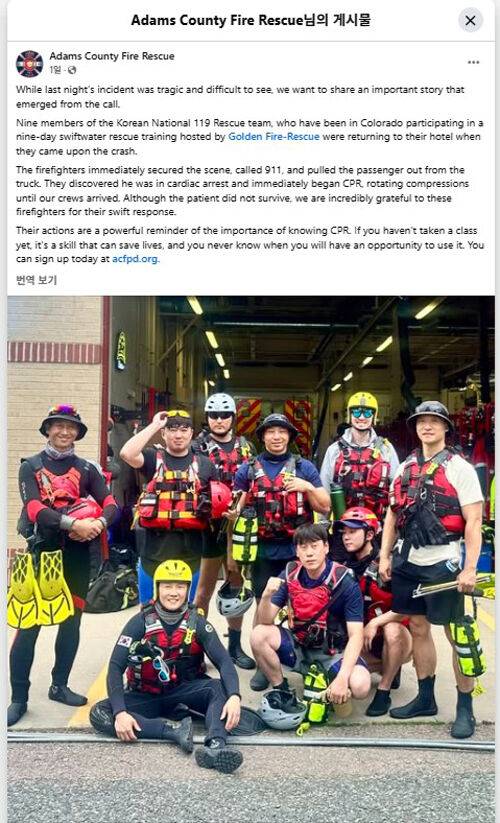 미국 콜로라도주 애덤스 카운티 소방서는 공식 SNS(페이스북) 계정을 통해 당시 교통사고 현장에서 있었던 한국 소방공무원들의 활동을 단체 사진과 함께 소개하며 "신속한 구조활동에 대단히 감사드린다"고 전했습니다.