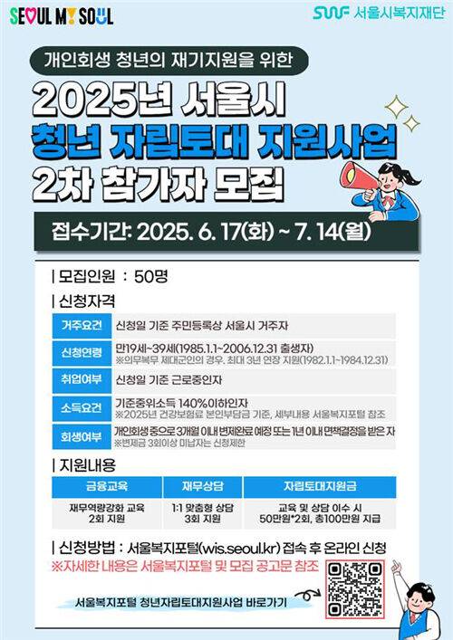 서울시복지재단 서울금융복지상담센터는 개인회생을 마친 청년을 지원하는 '서울시 청년자립토대지원사업' 2차 참가자를 모집합니다.