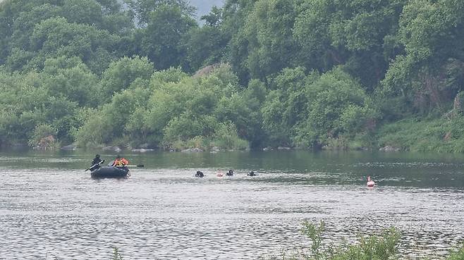 ▲ 16일 홍천강에서 물놀이하던 10대 4명이 급류에 휩쓸리는 사고로 남학생 1명이 실종된 가운데 17일 소방 당국이 이틀째 수색 작업을 벌이고 있다.