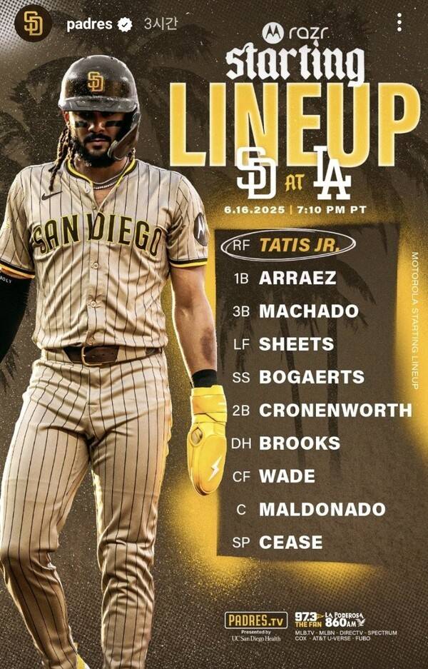 현재 샌디에이고는 내셔널리그 서부지구 선두 LA 다저스에 3경기 차로 뒤져 있다. 오는 17일 다시 맞붙는 두 팀은 또 한 번 치열한 경쟁을 예고했다. 샌디에이고는 에이스 딜런 시즈와 반등에 성공한 타티스를 앞세워 추격에 나선다.