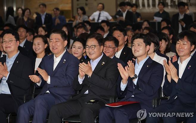 (서울=연합뉴스) 류영석 기자 = 우원식 국회의장, 더불어민주당 김병기 당대표 직무대행 겸 원내대표, 국민의힘 김용태 비상대책위원장 등이 17일 서울 여의도 국회 탄소 중립 선언식에서 박수치고 있다. 2025.6.17