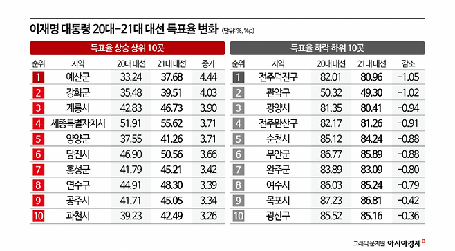 득표율 상승 10위 안에 예산군·계룡시·세종특별자치시·당진시·홍성군·공주시 등 6곳이 충청권에 있었다.