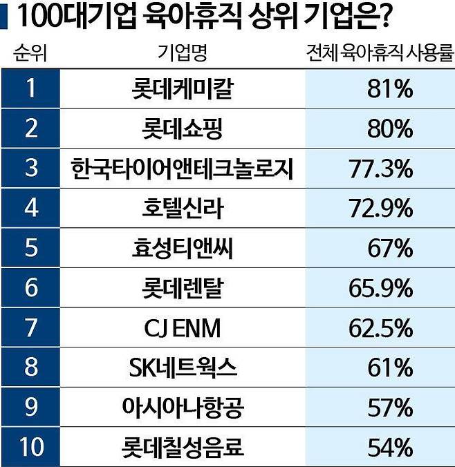 이런 가운데 눈에 띄는 성과를 보인 기업도 있다. 롯데그룹이 대표적이다. 남성 육아휴직 사용률 2위를 기록한 롯데케미칼(71%)을 필두로 롯데쇼핑(3위), 롯데렌탈(5위), 롯데칠성음료(6위), 롯데웰푸드(7위) 등이 상위권을 휩쓸었다. 특히 롯데케미칼은 남녀 합계 전체 육아휴직률 1위, 롯데쇼핑은 2위에 올랐다. 2017년부터 시행된 '남성 육아휴직 의무화' 제도 덕이다. 배우자 출산 시 최소 1개월 이상 육아휴직을 사용하도록 하고, 첫 달에는 통상임금의 100%를 보전해준다. 복직자에게는 업무 적응 지원 프로그램도 제공해 심리적 부담을 덜어준다.