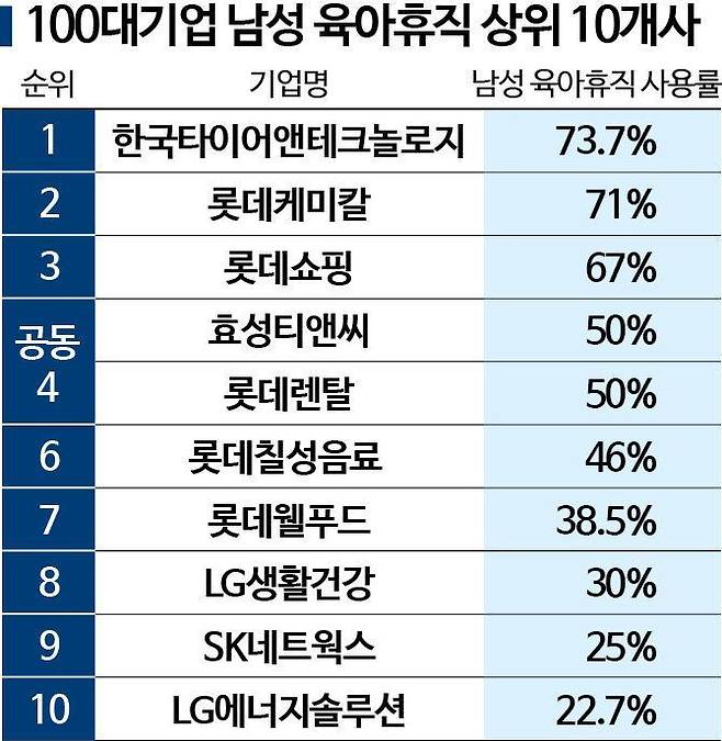 한국타이어앤테크놀로지의 육아휴직 사용률도 눈에 띈다. 전체 육아휴직률은 77.3%로 3위에 올랐고, 남성만 놓고 보면 73.7%로 1위를 차지했다. 섬유 및 무역 전문 기업 효성티앤씨도 남성 사용률이 50%로 상위권에 이름을 올렸다. 두 기업 모두 남성 직원의 비중이 큰 업종임에도 높은 사용률을 기록했다는 점에서 조직 문화가 육아휴직 활용에 결정적인 역할을 한다는 점을 보여준다.