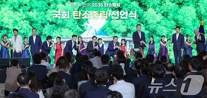 (서울=뉴스1) 안은나 기자 = 윤종오 진보당 원내대표(왼쪽부터), 주호영 국회 부의장, 한창민 사회민주당 대표, 김용태 국민의힘 비상대책위원장, 우원식 국회의장, 김병기 더불어민주당 대표 직무대행 겸 원내대표, 천하람 개혁신당 대표 권한대행 겸 원내대표, 이학영 부의장, 서왕진 조국혁신당 원내대표가 17일 오전 서울 여의도 국회 로텐더홀에서 열린 국회 탄소중립 선언식에 참석해 탄소중립 비전 퍼포먼스를 하고 있다. 2025.6.17/뉴스1