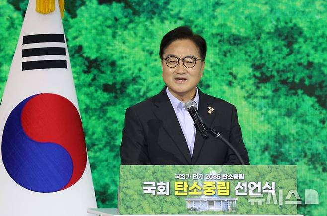[서울=뉴시스] 조성봉 기자 = 우원식 국회의장이 17일 오전 서울 여의도 국회 로텐더홀에서 열린 국회 탄소중립 선언식에서 탄소중립 로드맵을 발표하고 있다. 2025.06.17. suncho21@newsis.com