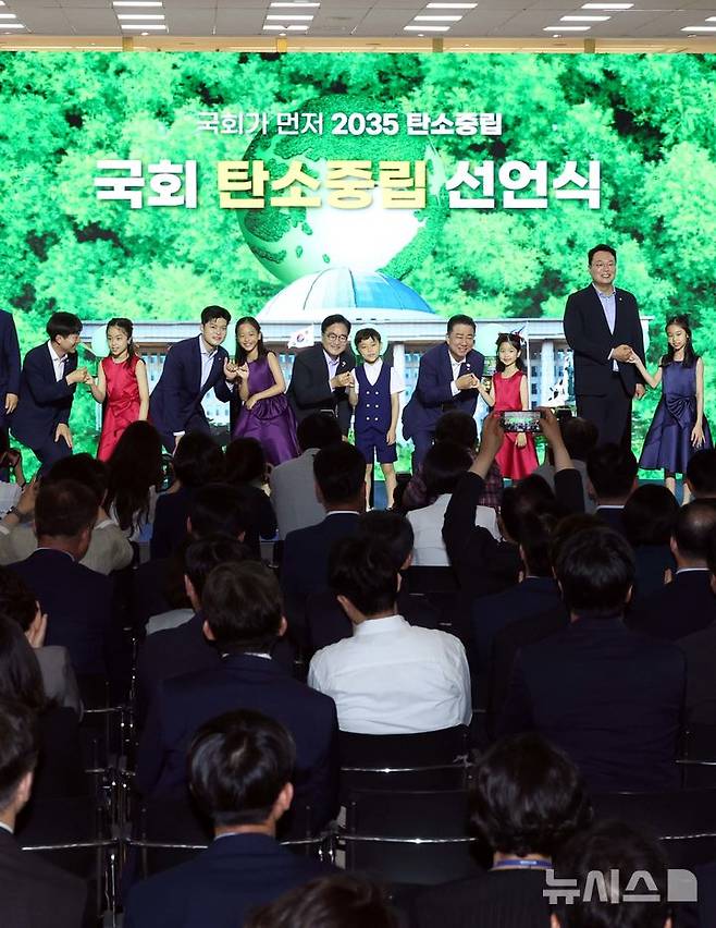 [서울=뉴시스] 조성봉 기자 = 우원식 국회의장과 여야 대표들이 17일 오전 서울 여의도 국회 로텐더홀에서 열린 국회 탄소중립 선언식에서 어린이들과 함께 탄소중립 비전 퍼포먼스를 하고 있다. 왼쪽부터 한창민 사회민주당 대표, 김용태 국민의힘 비상대책위원장, 우원식 국회의장, 김병기 더불어민주당 대표 직무대행 겸 원내대표, 천하람 개혁신당 원내대표. 2025.06.17. suncho21@newsis.com