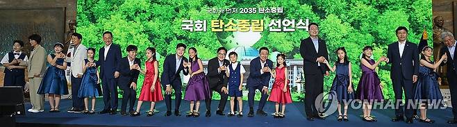 (서울=연합뉴스) 류영석 기자 = 우원식 국회의장, 더불어민주당 김병기 당대표 직무대행 겸 원내대표, 국민의힘 김용태 비상대책위원장 등이 17일 서울 여의도 국회 탄소 중립 선언식에서 어린이들과 함께 기념촬영을 하고 있다. 2025.6.17 [공동취재]