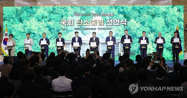 (서울=연합뉴스) 류영석 기자 = 우원식 국회의장, 더불어민주당 김병기 당대표 직무대행 겸 원내대표, 국민의힘 김용태 비상대책위원장 등이 17일 서울 여의도 국회 탄소 중립 선언식에서 기념촬영을 하고 있다. 2025.6.17